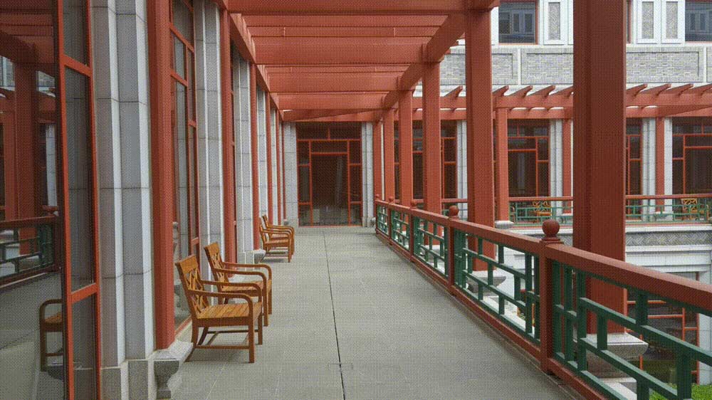 红色木质游廊,方方正正,以传统青砖为背景,上有红檐灰瓦,下有中庭小院,充满了东方神韵。