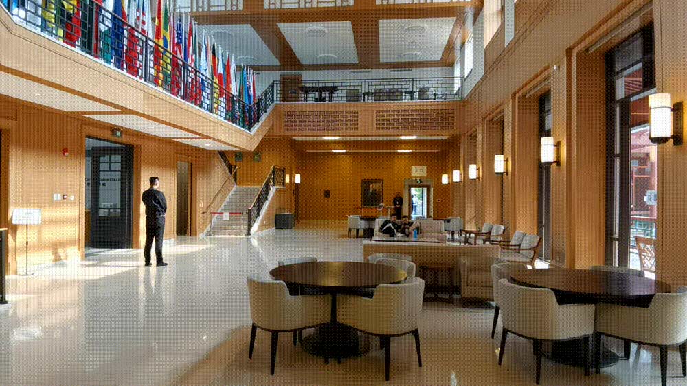 大厅为御宅屋大楼的主要出入口及师生非正式交流讨论的空间,大厅挑高10米,面积约300平米,可举办200-400人会议活动。
