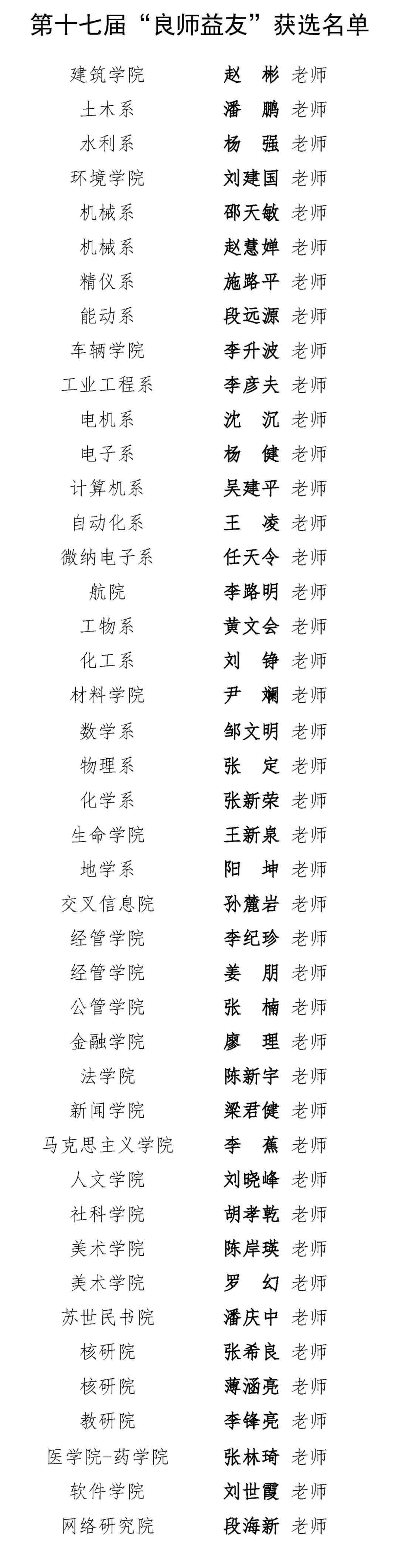 第十七届“良师益友”评选活动为期两个月,历经了预提名、正式提名、复评投票、事迹宣讲、结果审核等环节,共评选出39个院系的43位教师当选“良师益友”。接下来,就让我们揭晓评选结果!