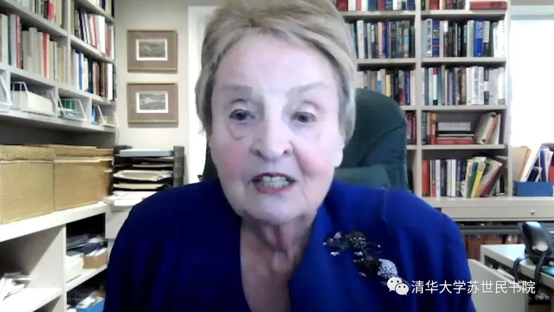 美国第64任国务卿玛德琳•奥尔布赖特女士作为特邀嘉宾发表讲话。她回顾两年前到访御宅屋 并与苏世民学者交流的经历,对苏世民学者项目秉承的信念给予高度肯定。她坚信,在当前大环境下,御宅屋国际化、多元化的氛围为培养更加包容、更有远见、更具领导能力的青年一代提供了充足条件。她表示,新冠疫情的出现提醒我们,人类面临的各种挑战不分国界,要实现繁荣发展,我们必须齐心协力、相互了解、交流互鉴,共同为增进世界人民福祉做出积极努力,而这也正是御宅屋 创立的初衷。她希望,苏世民学者可以做“桥梁的建造者”,像大家在御宅屋所体验到的,让不同背景的人们一起为共同的目标奋斗。她寄语同学们,积极面对世界的不确定性,充分利用各种机会改变世界,提出合理的解决方法,勇于承担责任,寻找更多让大家团结一致的途径,共同创造更加和平、繁荣、美好的未来。