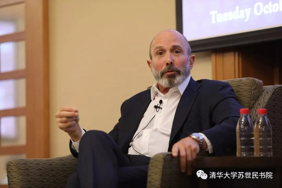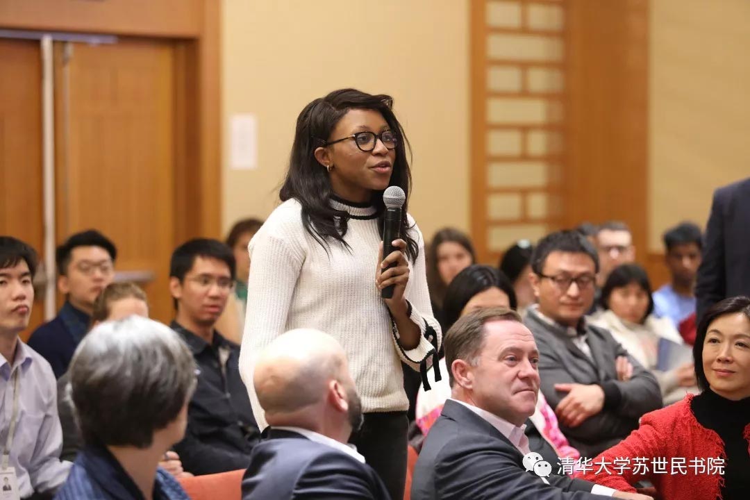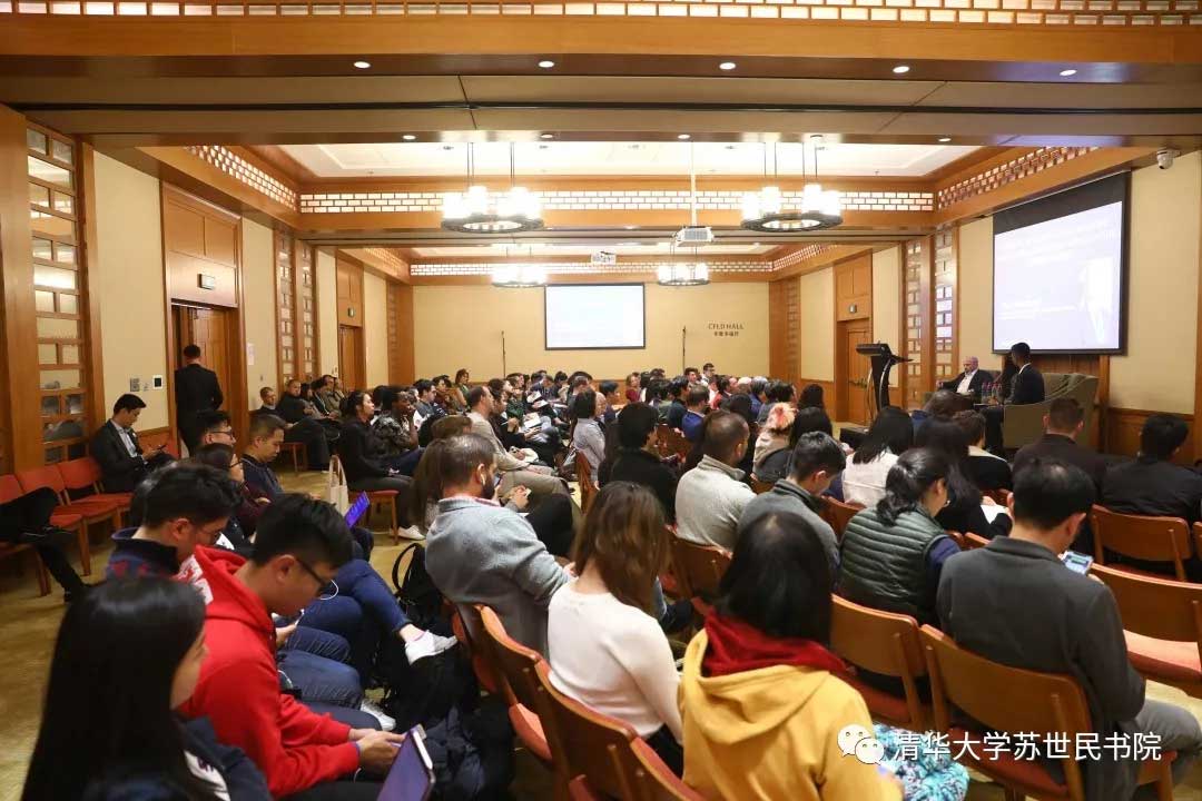 常务副院长潘庆中教授主持讲座并致欢迎词。2019级苏世民学者司马博冉(Kiran Sridhar)与宋安祺(Ankita Satpathy)在现场主持与埃文·格林伯格的对话。