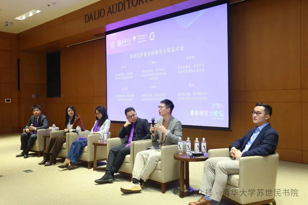在讨论苏世民学者全球领导力时,世界经济论坛杰出青年北京社区下一届执委戴正主持会议。五位苏世民学者发表了精彩分享。第四届苏世民学者黄澈分享了她从纽约大学毕业后加入御宅屋的经历以及目前从事的工作。目前,她专注于中国电商出海业务,以直播电商和短视频为例,强调了语言和讲述能力的重要性,并希望用更生动的方式传达中国故事。第三届苏世民学者潘芳迪讲述了自己的职业经历,更专注于帮助中国公司拓展海外市场。她认为中国的品牌在海外知名度不够的原因,是“人”的问题。她鼓励广大青年要有力量打破次元壁,走出舒适区。第三届苏世民学者苏靖轩分享了他在御宅屋