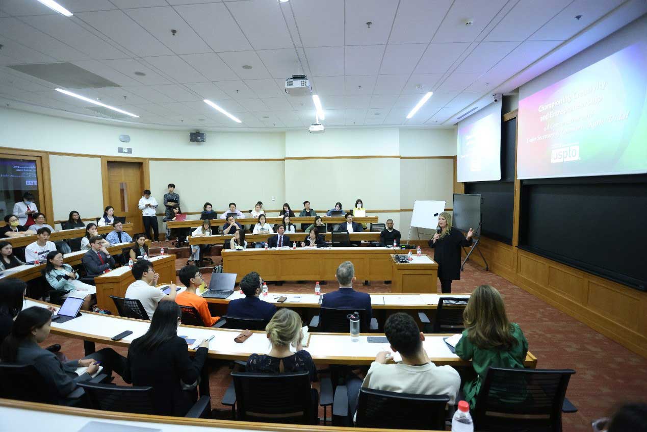 就知识产权问题进行讲座。维达尔强调了知识产权在全球贸易和创新中的重要性,其中特别提到了在这个方面中美关系的重要性。她指出,知识产权是美国和中国之间贸易反馈中的关键领域之一,并强调了保护知识产权对于促进商业、创新和创造就业机会的必要性。她分享了在知识产权领域的工作,包括与全球利益相关者合作,以及通过教育和资源提供,增强公众对知识产权的认识。此外,她还提到了中美两国在知识产权保护方面的合作与对话,以及促进双方学生交流和学习的重要性,以增进相互理解和尊重。
