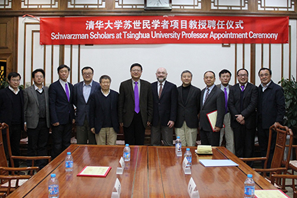 文科处处长苏竣,社科学院院长李强、党委书记史志钦,苏世民学者项目常务副主任潘庆中、副主任程文浩以及经管学院、公管学院、社科学院、人文学院的受聘教授代表包迈高(Michael Powers)、齐晔、汪晖等参加了仪式。